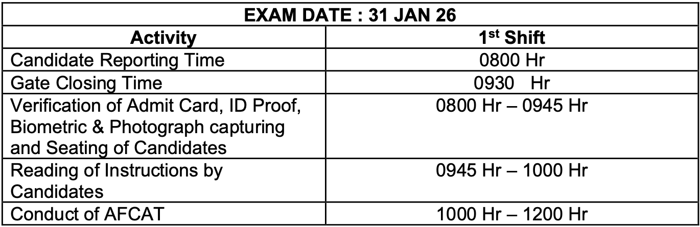 Online AFCAT examination is expected to be conducted on 31 January 2026. The AFCAT exam will be conducted as per the following schedule