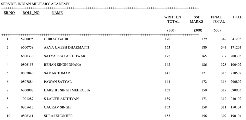 The following are the marks, in order of merit, of the recommended candidates who have qualified on the basis of the results of the CDS (1), 2025 conducted by the Union Public Service Commission and Interviews held by the Services Selection Board of the Ministry of Defence for admission to the Indian Military Academy, Indian Naval Academy, Air Force Academy and Officers Training Academy, Chennai.