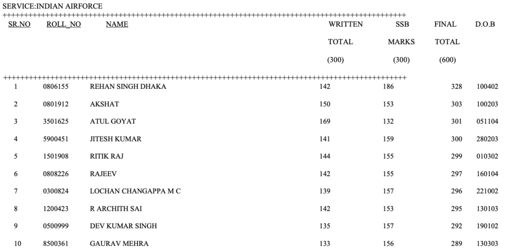 For Air Force Academy 35 candidates were recommended in CDS 1 2025 exam. The cut-off of AFA was 128 marks. The list below shows the top candidates as per the merit.